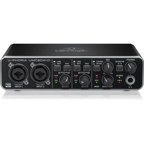 The Behringer UMC204HD Soundcard is a versatile 2-in/4-out USB audio interface designed for musicians, podcasters, and producers seeking professional-grade audio quality on a budget. It features Midas-designed mic preamps, 24-bit/192kHz converters, and a robust build, making it suitable for both studio and mobile recording setups.