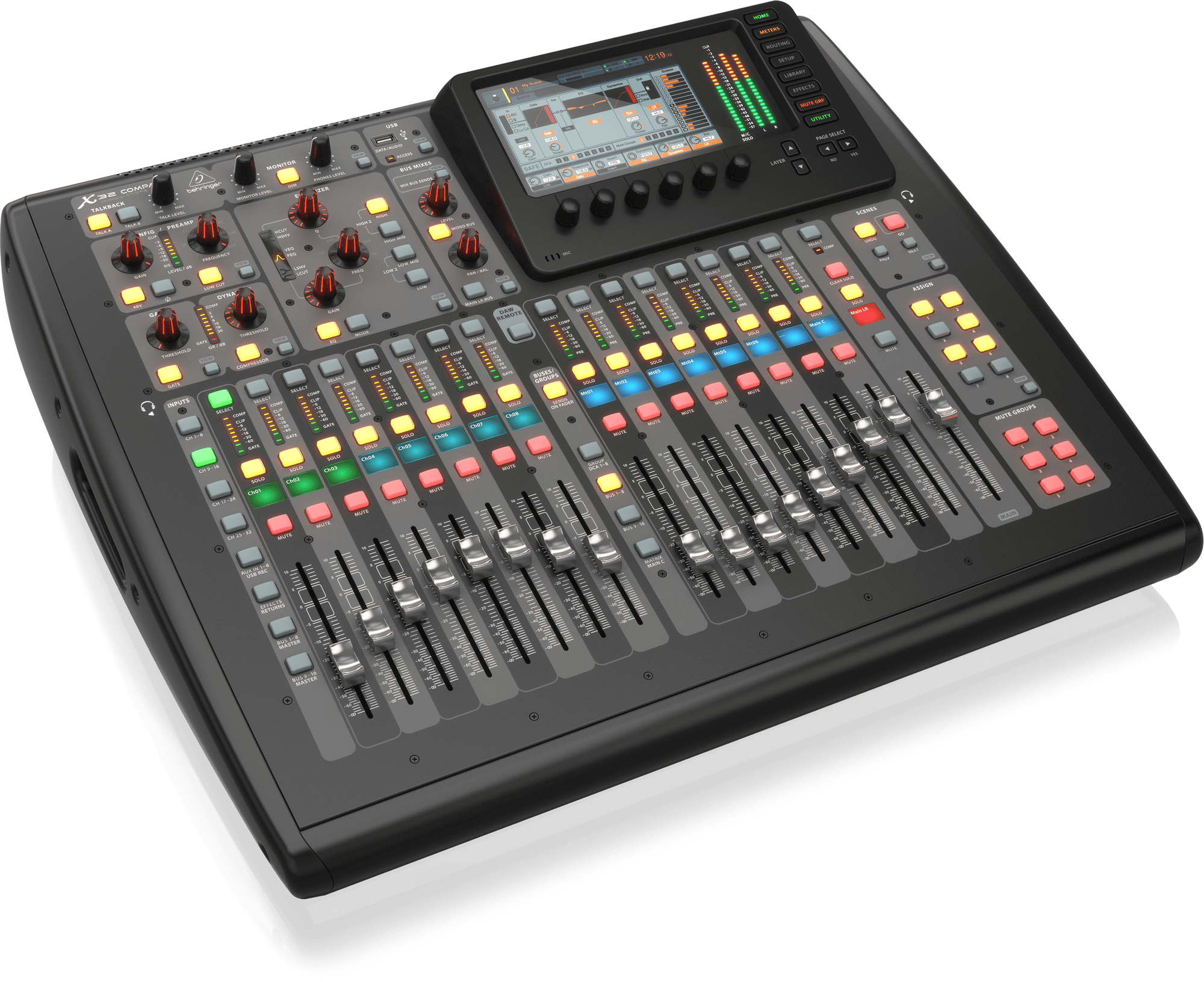 You can easily control every parameter of the mix directly on the X32 COMPACT using the 800 x 480 graphic UI, but the awesome flexibility of networked remote control literally opens up an amazing world of possibilities. Use our X32-EDIT PC/Mac/Linux application, X32-MIX for iPad, X32-Q for iPhone/iPod touch and X32-Q for Android to control the mix from anywhere in the room. You can even run multiple instances of these powerful apps at the same time, giving your performers the ability to mix their own personal monitors on-the-fly!