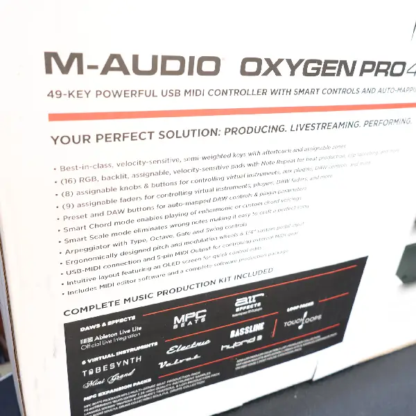 M-Audio Oxygen Pro 49 is a powerful, 49-key USB powered MIDI controller complete with an arsenal of must-have production tools to streamline your creative process. It doesn’t matter if you want to create music on the go or in the studio, the M-Audio Oxygen Pro series is perfectly flexible for any workflow. Premium Response, Hands-on Control Fusing 49 best-in-class, velocity-sensitive, semi-weighted keys with after touch and assignable zones with a built in arpeggiator, 16 RGB, backlit, assignable, velocity-sensitive drum pads with Note Repeat, 8 assignable knobs and 9 assignable faders, Oxygen Pro 49 comes complete with everything you need to get the most out of your virtual instrument collection and DAW. Seamless DAW & Performance Control with Auto-Mapping With the easy to read OLED screen, configuring the Oxygen Pro 49 with any mainstream DAW couldn’t be simpler. Whether you use MPC Beats, Ableton Live, Cubase, Logic, Studio Keyboard One or any other music making platform, simply select the map and Auto-Mapping will take care of the rest. Smart Controls With Smart Chord and Smart Scale technology, Oxygen Pro 49 removes any and all barriers to your production. With Smart Chord activated, pressing a single key or pad will play a full chord with easy-to-use options to set chord properties and customized progressions across the keybed. With Smart Scale, Oxygen Pro 49’s keybed can be configured to one of 16 scale variations, so only notes in the selected scale are played. Premium Software Suite Record, sequence, arrange and mixdown your tracks with a choice of two professional DAWs including MPC Beats and Ableton Live Lite. Find and create any sound imaginable with a virtual instrument collection from legendary developer AIR Music Tech and dive into a world of cutting-edge sound content with a collection of Expansion Packs from Akai Professional’s legendary MPC Series.