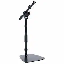 The microphone stand is designed for floor and tabletop use. The stand offers a height-adjustment range of 11.2 to 15.75″, using a boom arm measuring 12.2″ in length that helps you close-mic sources like guitar amplifiers or vocals (in a tabletop setting).