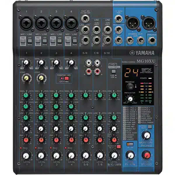 The Yamaha MG10XU analog mixer is well-suited for small, portable rigs, with its rich features and outstanding sound quality.